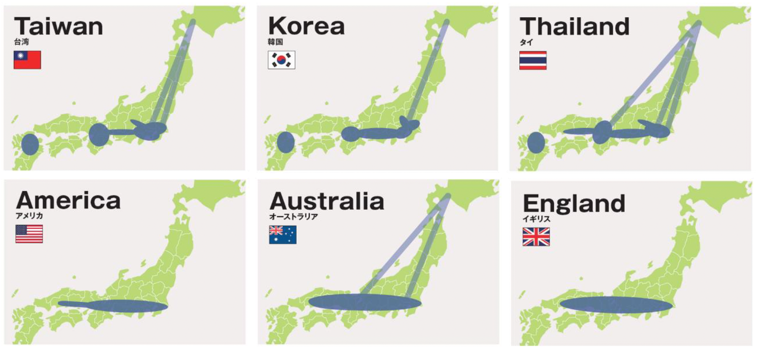 市場別の全国主要周遊ルートに入る都道府県を示したMAP