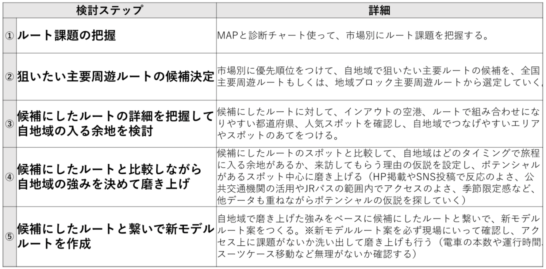 訪日客の周遊を分散させ、自地域に誘致する新たな周遊モデルルートの検討ステップ