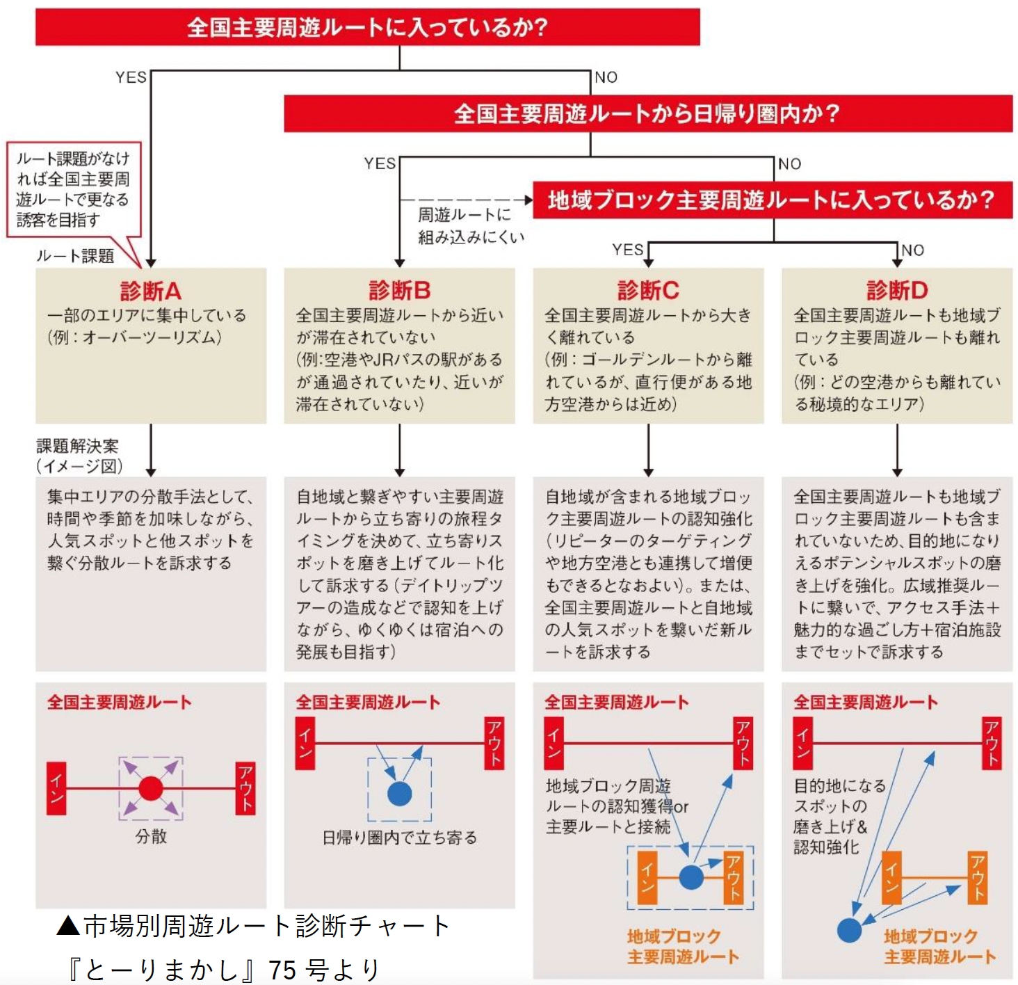 市場別の主要周遊ルートの可視化と課題の診断チャート・課題解決の検討ステップを作成