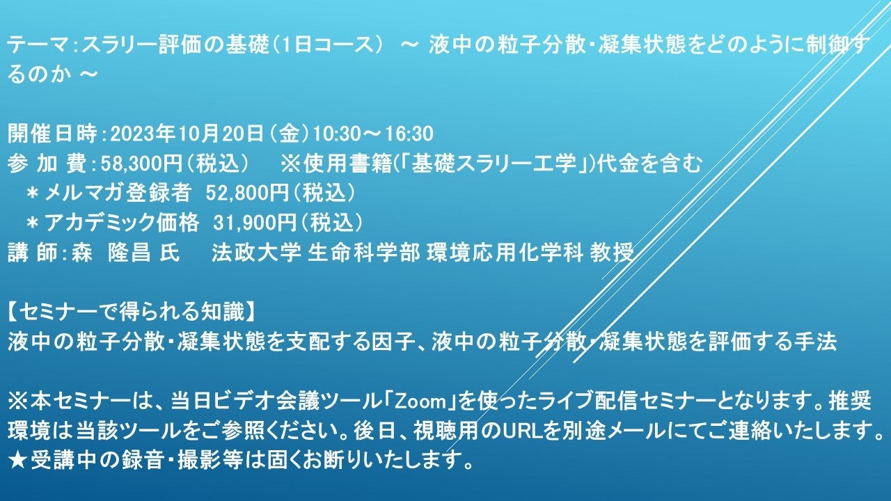 【ライブ配信セミナー】スラリー評価の基礎(1日コース) 〜 液中の粒子分散・凝集状態をどのように制御するのか 〜 10月20日(金)開催 主催:(株)シーエムシー・リサーチ