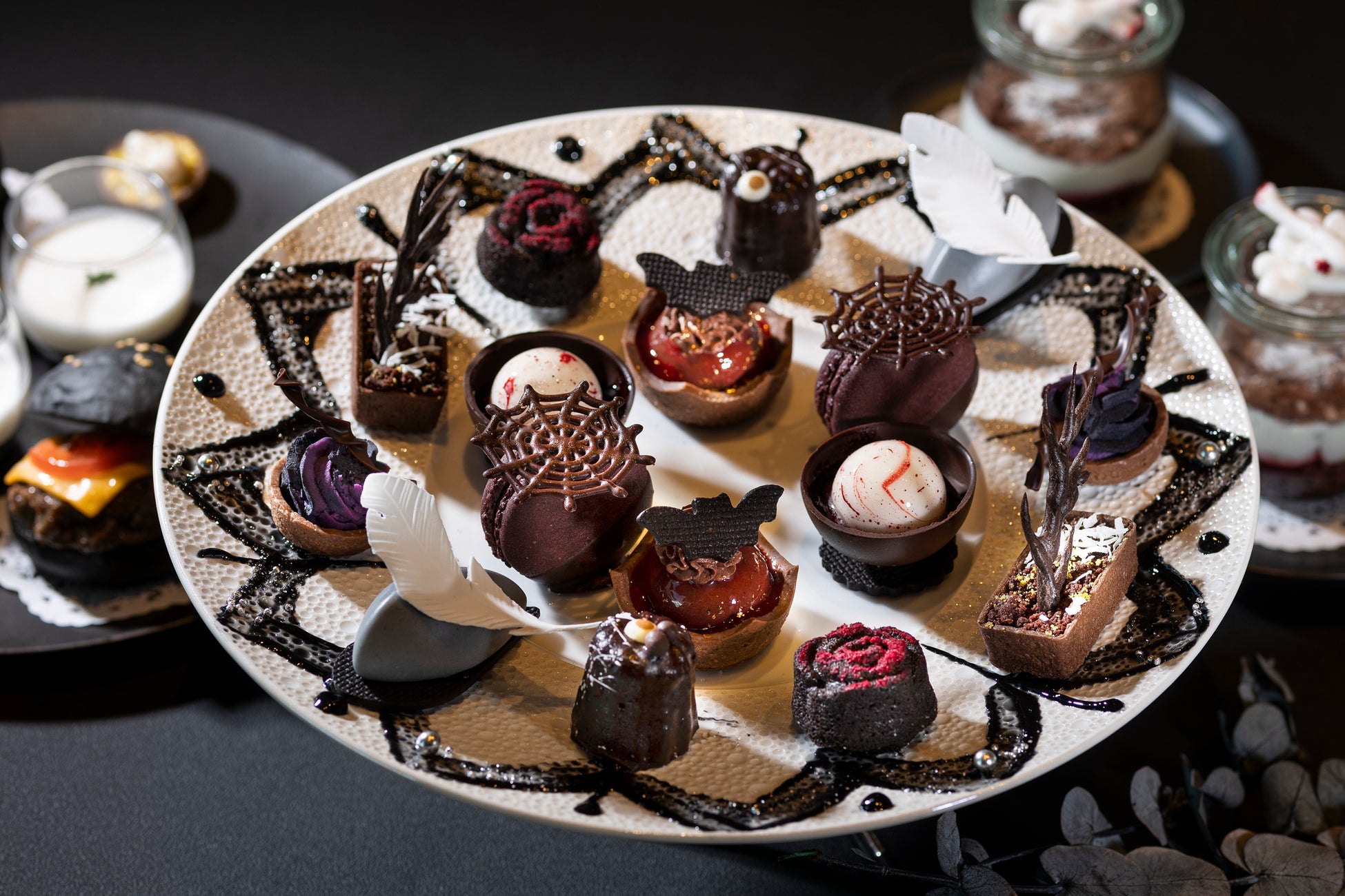 スイーツプレートにはレースを描き、コウモリのクッキーを飾ったフランボワーズショコラや美しいローズをデザインしたフィナンシェ、秋の味覚である紫芋を使ったモンブランなどを並べます。セイボリープレートは、トリュフ風味のソイスクランブルタルトや、ブラックのパンにかぼちゃとハムを挟んだサンドウィッチなどをラインナップ。グラススイーツにはチョコレートの生地にクリームやチェリーを重ねたフォレノワールをご用意いたします。