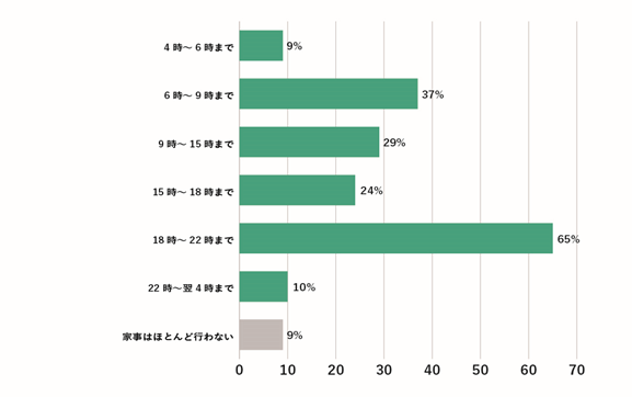 共働き・単身世帯で、仕事や育児を終えた夜に家事が集中。特に「食後の片付け」「食事の準備」「洗濯」などが夜間に多く行われています。 -