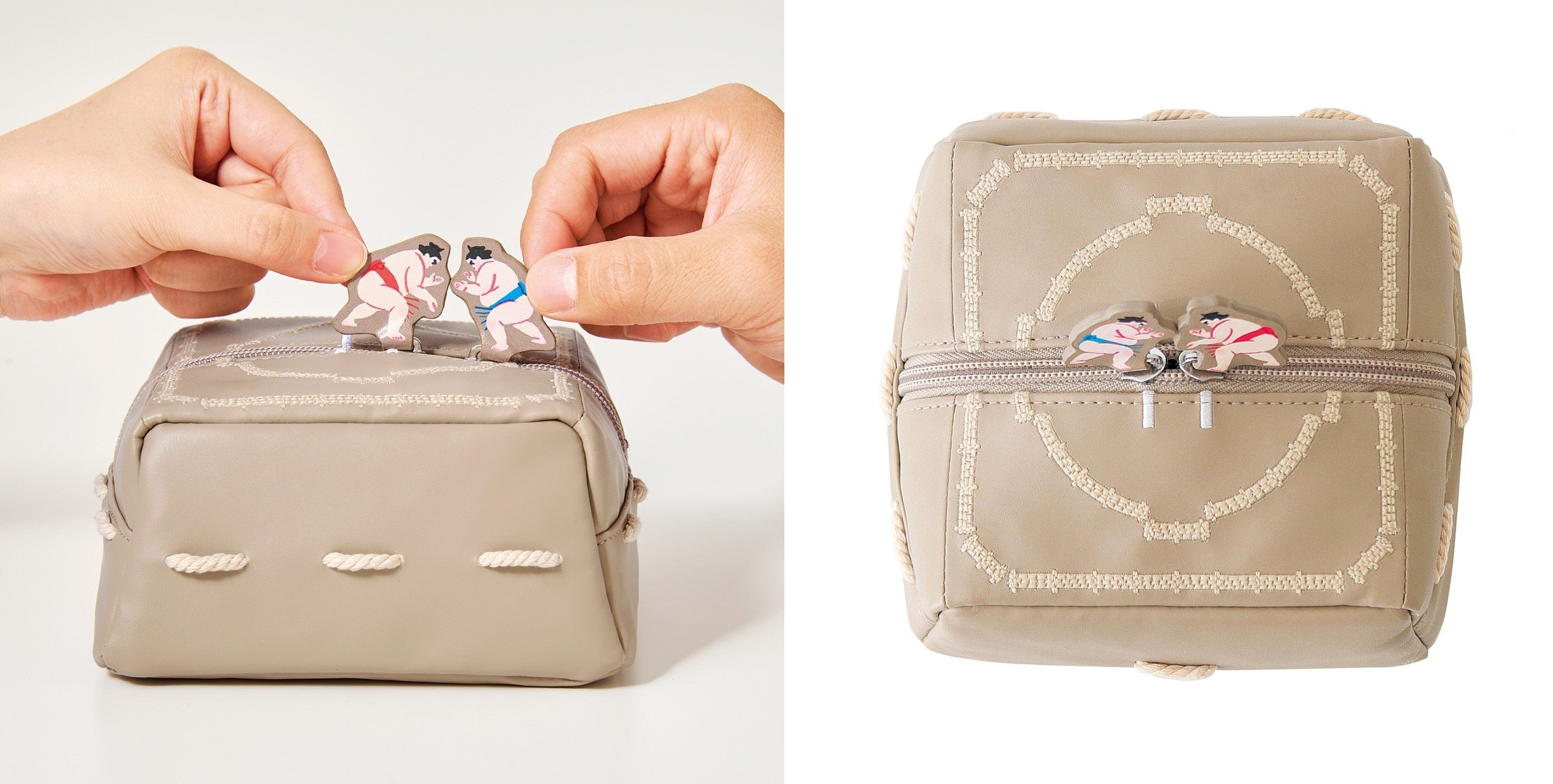 土俵で取り組みをする力士がポーチに。ファスナートップの力士が、ポーチの開閉で土俵入りから取組までを再現、ポーチを開閉する度、いつでも相撲が楽しめます。ポーチ本体は、実際に土俵に使われる荒木田土(あらきだつち)をイメージしたマットな生地をセレクト。徳俵、角俵、勝負俵、上げ俵とそれぞれ4種類ある俵を刺しゅうを重ね、踏み俵はロープで立体的に表現するなど、リアルな立体感で仕上げるこだわり様です。