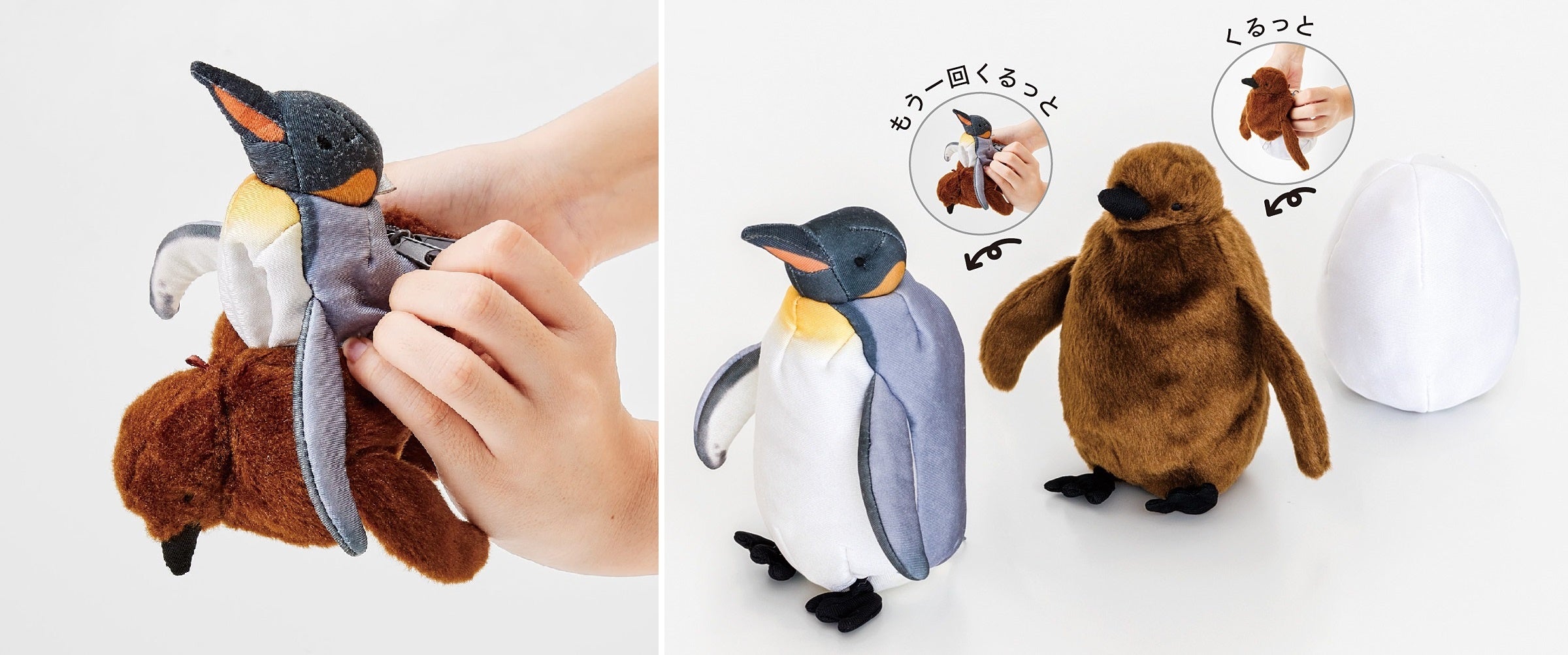 クルッとひっくり返すと卵からヒナへ、そしてもう一度ひっくり返すと堂々としたオウサマペンギンに。世にも珍しい、3種類の形状に変身するぬいぐるみが海遊館とのコラボで誕生。ペンギン飼育員さんのマニアックすぎるこだわりポイントも忠実に再現しています。育てて、ナデナデして、お出かけに。たくさん愛(め)でてください。【意匠登録済み】
