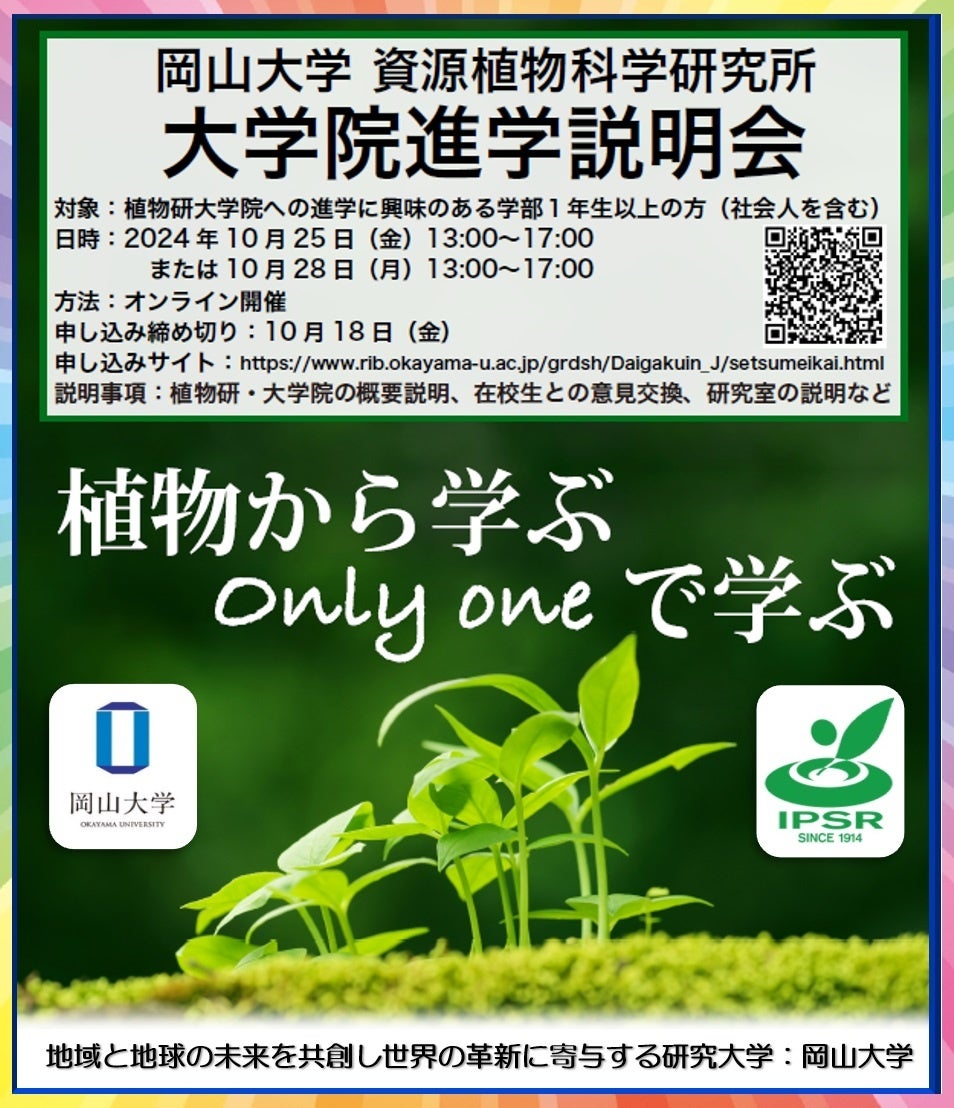 国立大学法人岡山大学(本部:岡山市北区、学長:那須保友)の高等先鋭研究院を構成する資源植物科学研究所(倉敷市中央)では、学院進学を検討されている皆様を対象に、「オンライン大学院説明会」を2024年10月25日(月)と10月28日(水)に開催します。