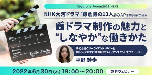 クリーク・アンド・リバー社(C&R社)は6月30日(木)、NHKで放送中の大河ドラマ『鎌倉殿の13人』のアシスタントプロデューサー(AP)として縦横無尽に活躍しているC&R社所属の平野詩歩が、大河ドラマ制作の魅力とクリエイターとしての働きかたを語る「Creator‘s Forum2022 NEXT」ウェビナーを開催いたします。