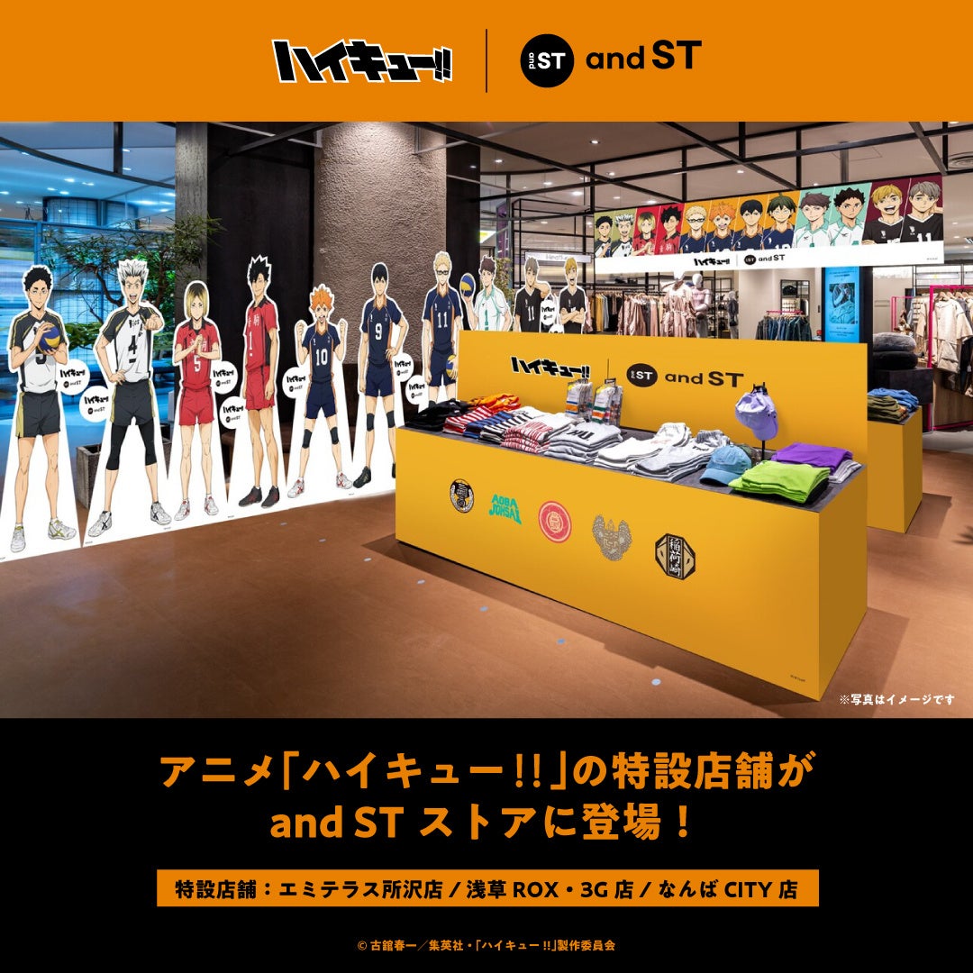 限定アイテムの発売を記念して、and STストア一部店舗にてアニメ「ハイキュー‼」のコーナーを設置いたします。また、特設ブース設置店舗として、3店舗(エミテラス所沢 / 浅草ROX・3G / なんばCITY)にて、今回限定アイテムに登場した10人のキャラクターの等身大パネルの設置、特設ブース、デジタルサイネージへの掲示を行います。
