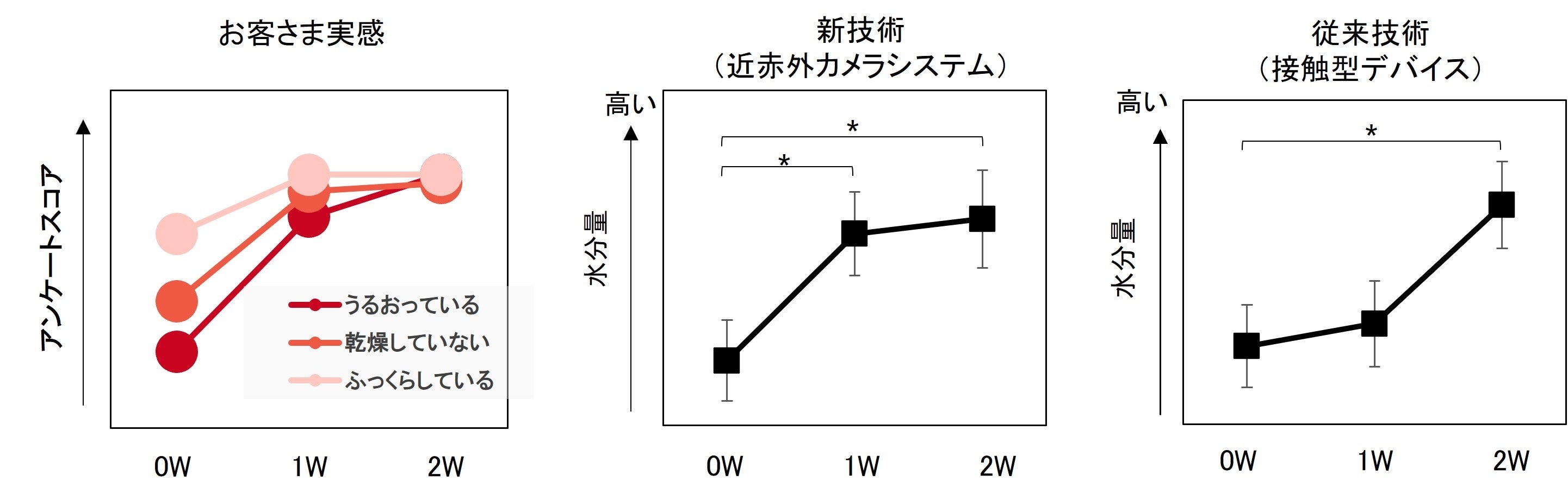 また、本技術を活用し、保湿ケアによる唇表面の乾燥改善効果を確認したところ、水分量の微細な変化を捉え、人の実感に近い形で水分量を定量評価できることがわかりました。今後、唇表面のうるおい状態を解析する新たな技術として、高いスキンケア効果を併せ持つ口紅など新たな製品・サービスの開発へ応用していきます。