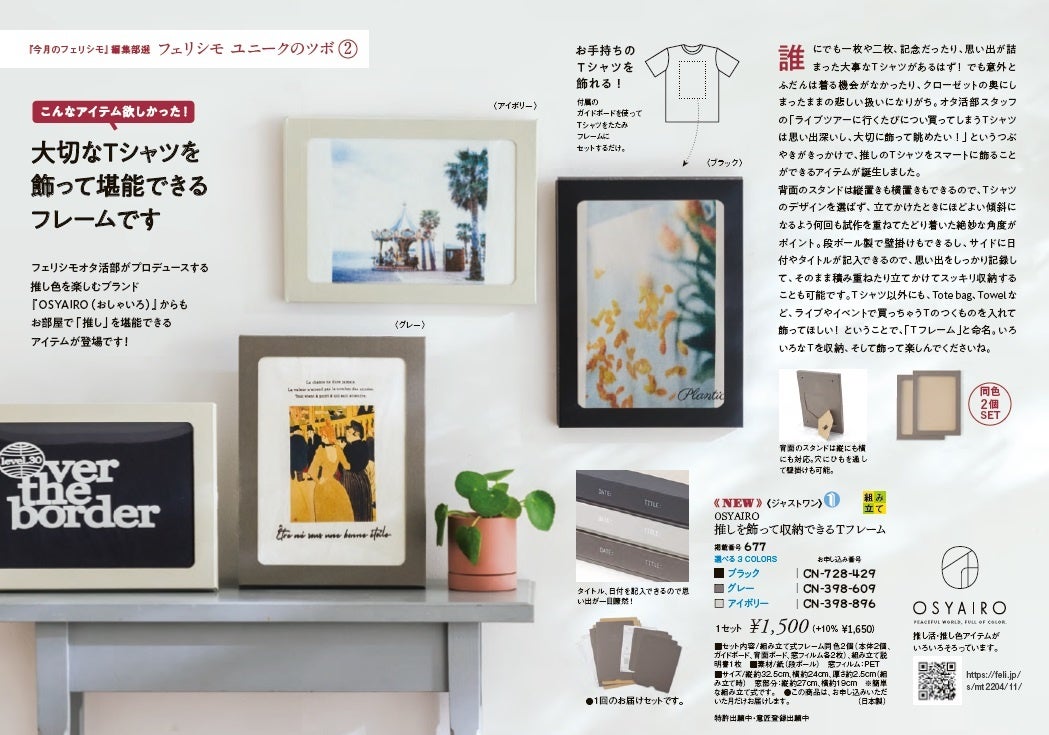 フェリシモが展開する「OSYAIRO[おしゃいろ]」は、新作アイテム「推しを飾って収納できるTフレーム」を発表、3月15日よりウェブ販売を行っています。新作アイテムは、ライブイベントで買ったTシャツやタオル、トートバッグなど、Tのつくなまえのグッズを収納して、アートのように壁や机に飾ることができるBOXフレームです。イベントの度に増えていく推しのグッズや、思い出のアイテムなど、大切なグッズを収納しておくだけでなくお部屋で堪能できるフレームで、インテリアなじむ〈ブラック〉〈グレー〉〈アイボリー〉3色展開です。ウェブメディア「OshiKra[オシクラ]」では、その開発ストーリーを掲載しています。アイテム詳細はデジタルカタログでもチェックできます。フェリシモのショップ「フェリシモ猫部 クリスタ長堀店」でOSYAIROコーナーを4月1日より展開しており、店舗でも購入できます。