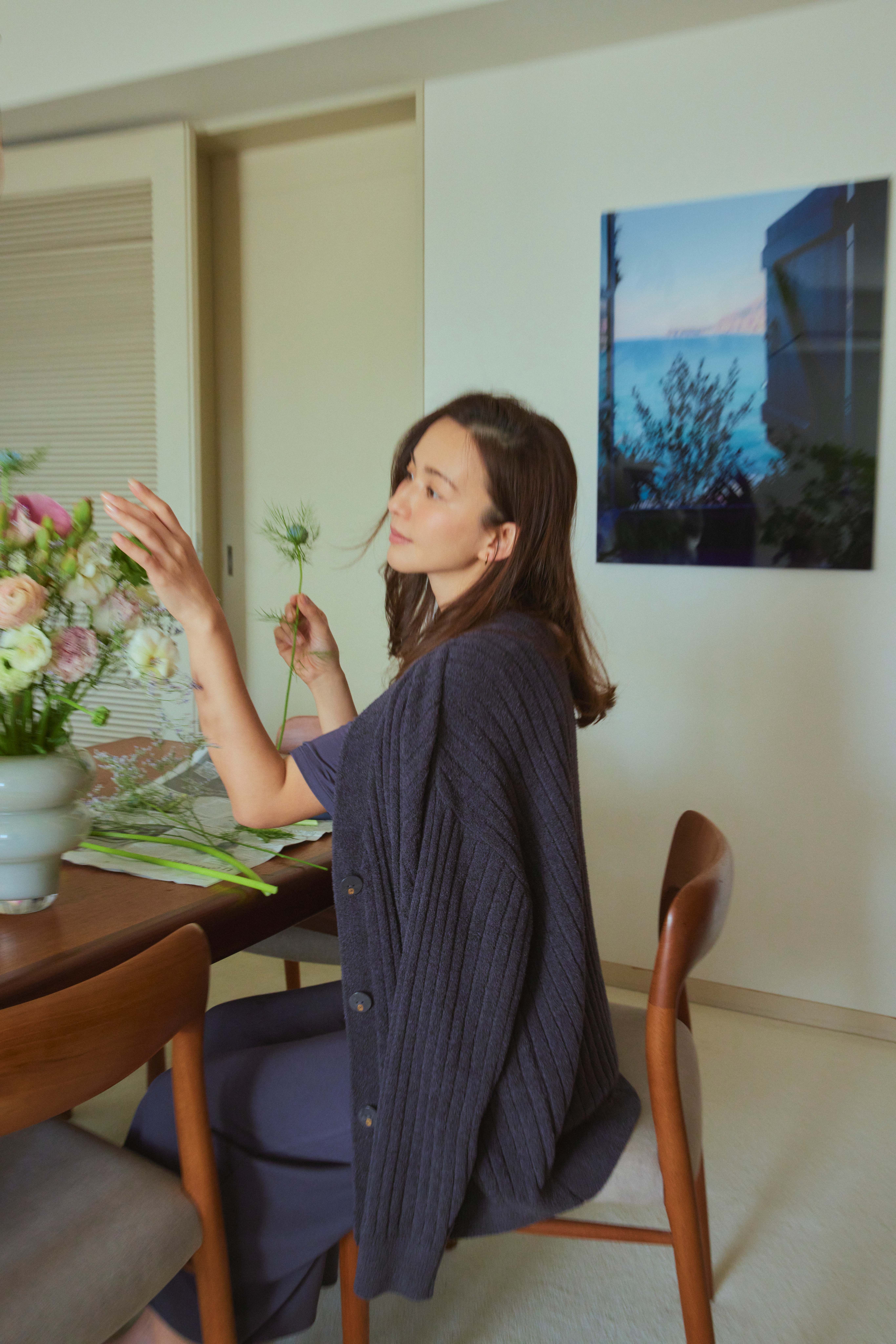 ワンピースは、身体のラインを拾いすぎず、カジュアルでありながらもエレガントなシルエットに。