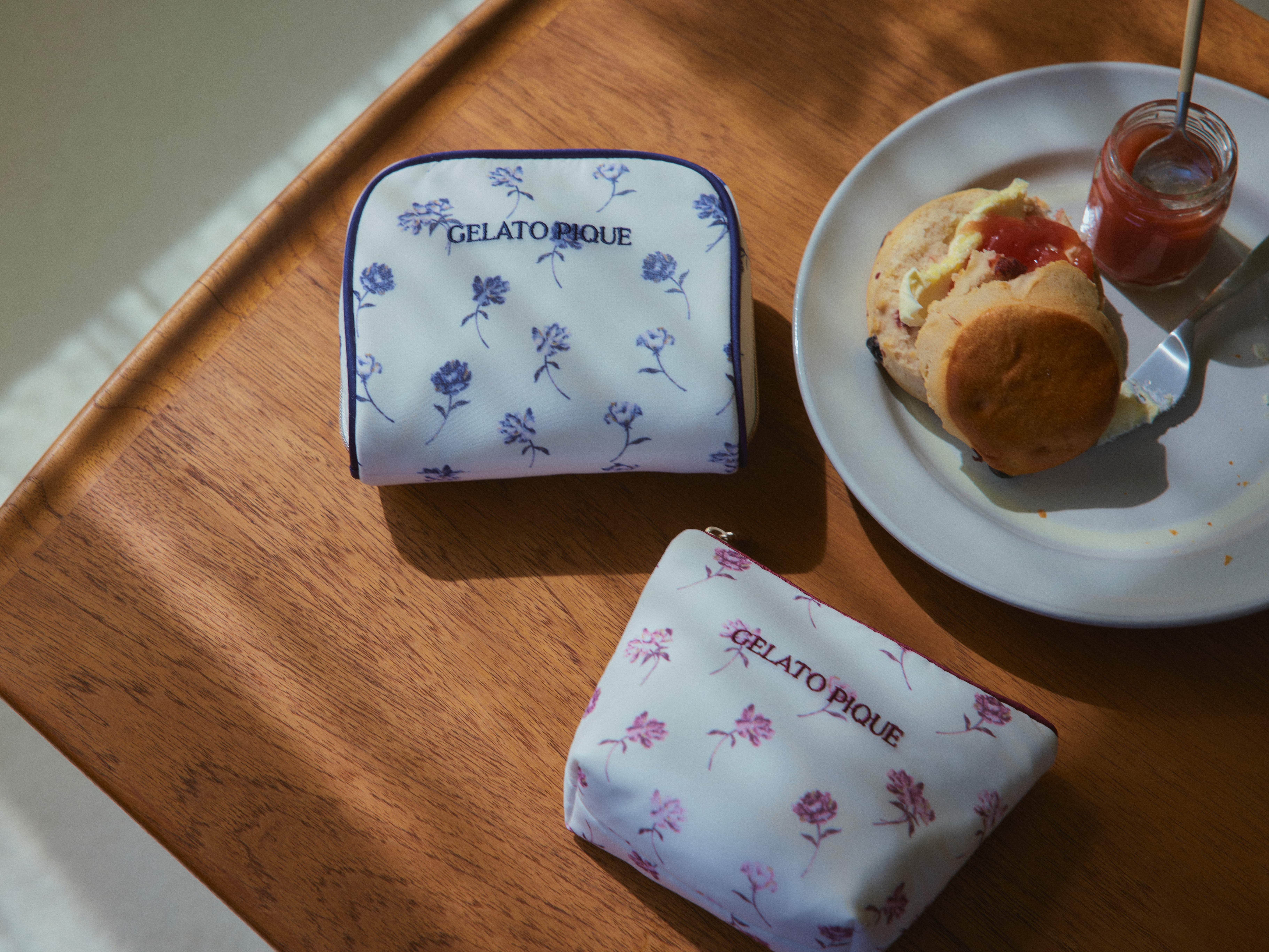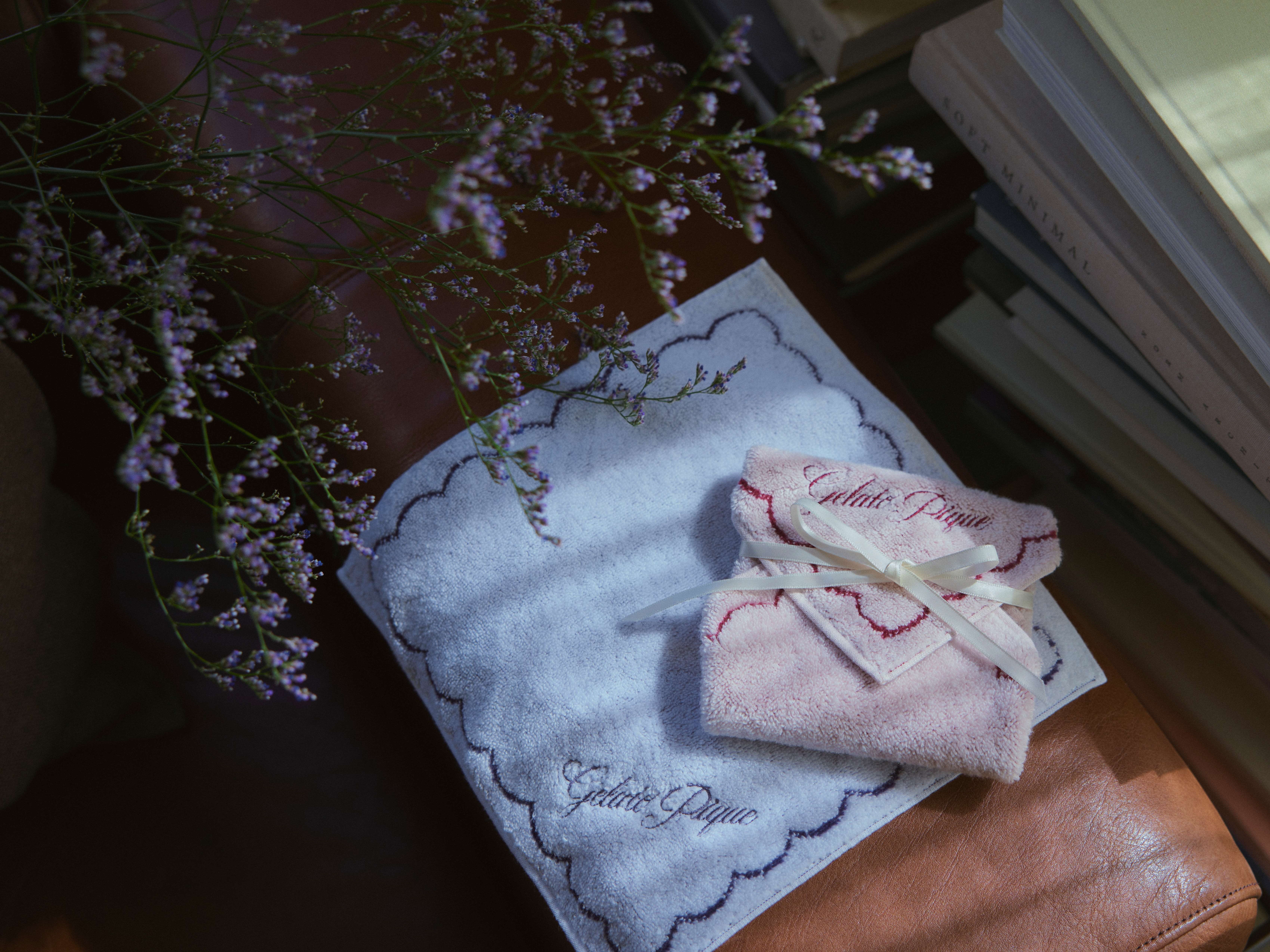 「愛」「美」が花言葉のローズが可憐に咲き誇るポーチや、女性らしいスカラップのデザインに万年筆で丁寧に書いたようなあたたかみのある筆記体ロゴ刺繍がポイントのハンドタオル。