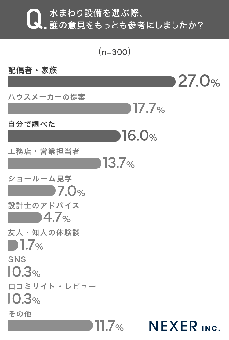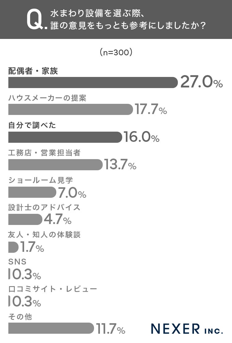 続いて、水まわり設備を選ぶ際に誰の意見を最も参考にしたかを調査しました。