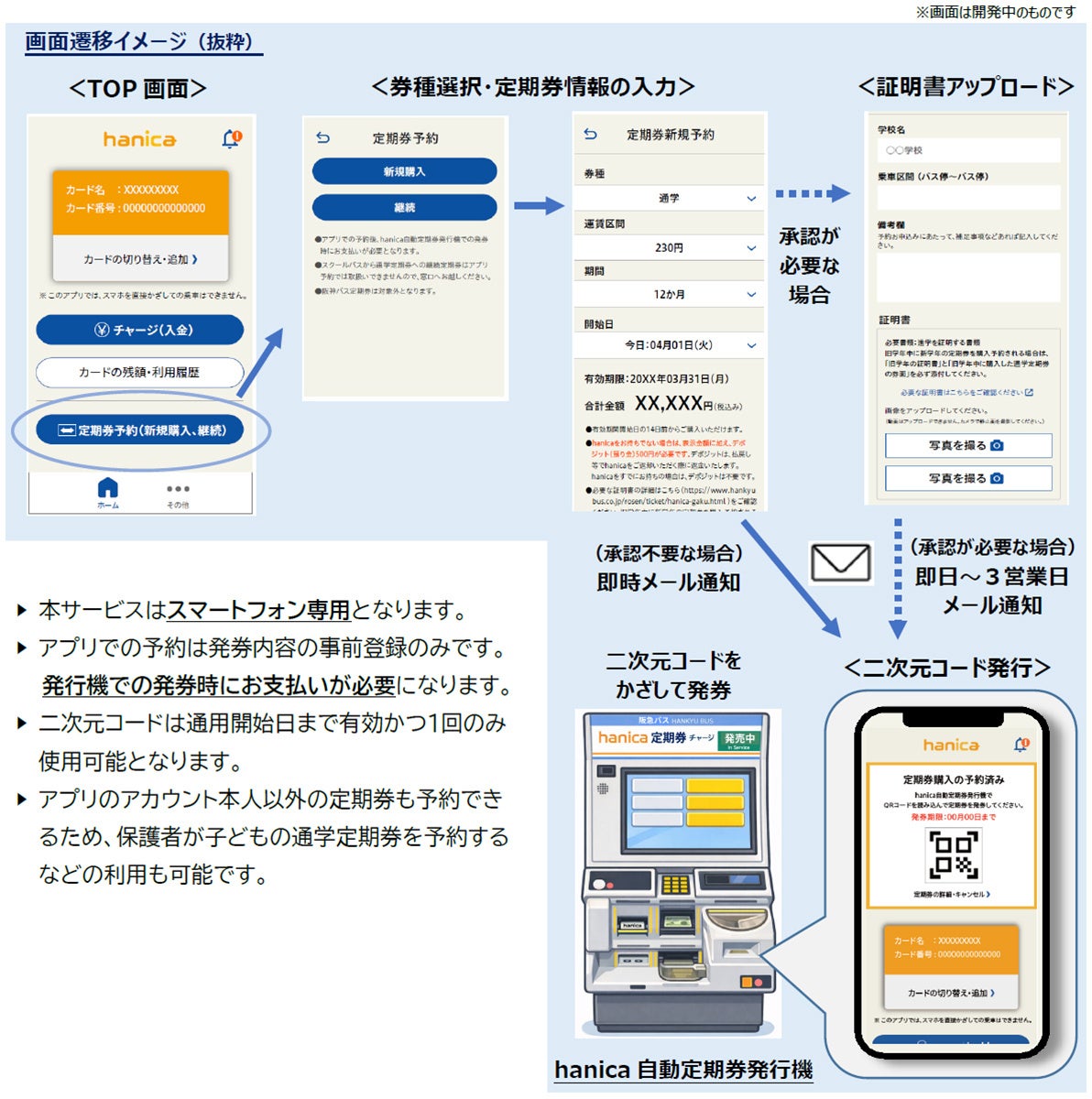 ◇従来、通学定期券の新規購入等には承認手続きのため案内所・営業所への来所が必要でしたが、本サービスではhanicaアプリ上で申請手続きが可能となり、窓口に来所することなく定期券をご購入いただけます。