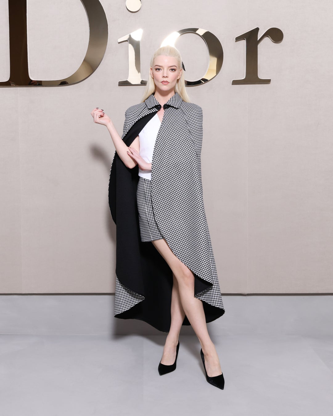 アニャ・テイラー=ジョイは、ブラック&ホワイトウールのケープを、対のスカートとホワイトのウール&シルクベストの上に纏い、ディオールのアクセサリーを合わせたルックで登場しました。