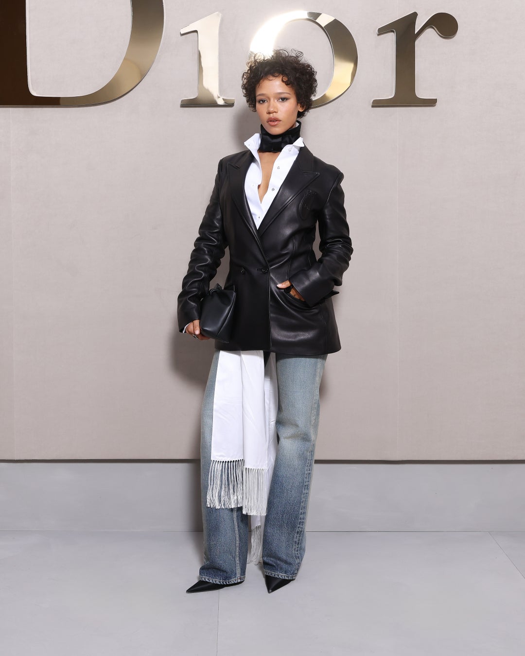 テイラー・ラッセルは、ホワイトのコットンシャツ、ホワイトのシルクスカーフ、ブルーのコットンパンツの上に、ブラックレザー「バー」ジャケットを着用しました。ディオールのアクセサリーも身に纏いました。