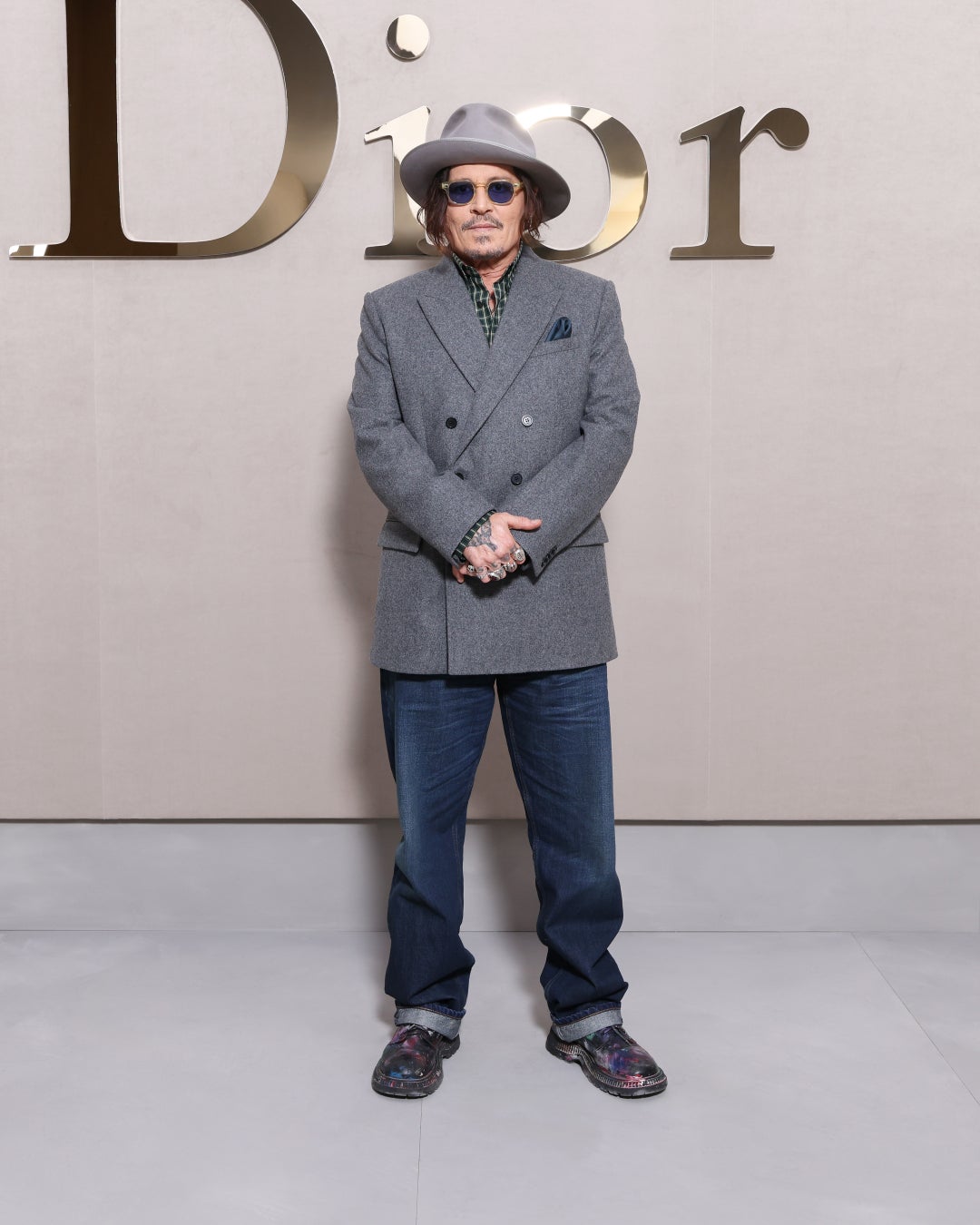 ジョニー・デップはグレーウールのダブルブレスト ピークドラペルジャケットに、グリーンのチェックをあしらったコットンシャツ、そしてブルーのデニムパンツを合わせたルックを披露しました。ディオールのアクセサリーも着用しました。