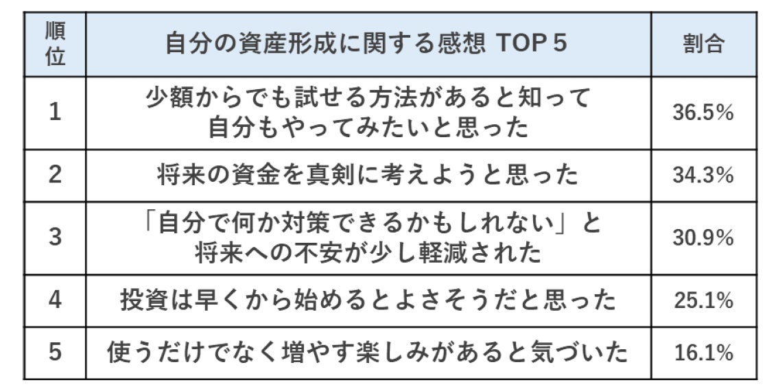 高校生にとって、まだ自分の自由になるお金はそう多くないと思いますが、そんな中でも、資産形成の授業を受けた後の自らの資産形成に関する感想TOP5を見ると、「少額からでもできることをやってみたい」、「真剣に考えたい」といった“やってみたい”という、しっかりと当事者の立場にいる感想が上位にランクイン。また、「将来への不安が少し軽減された」というポジティブな感想も見られました。