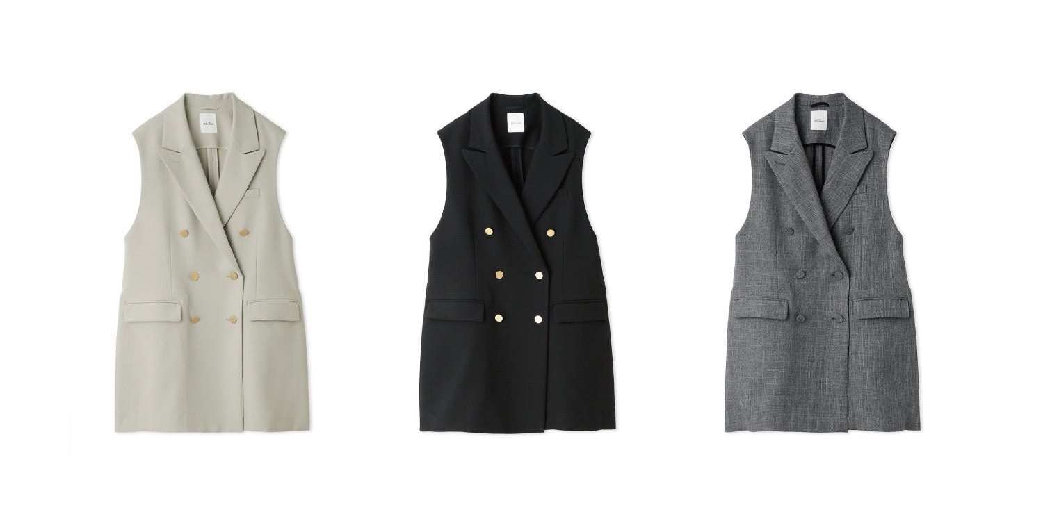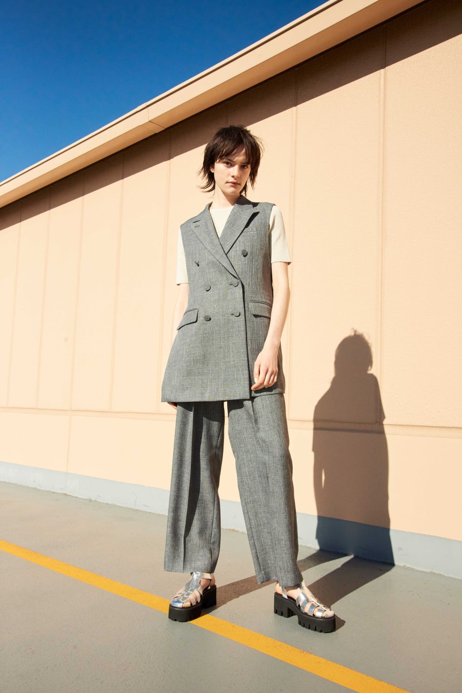 カジュアルなTシャツとデニムの上に1枚羽織るだけできちんと感が出る、テーラードベストと同素材パンツのセットアップ。ベストはワンピースなどレディなアイテムとの合わせもおすすめです。