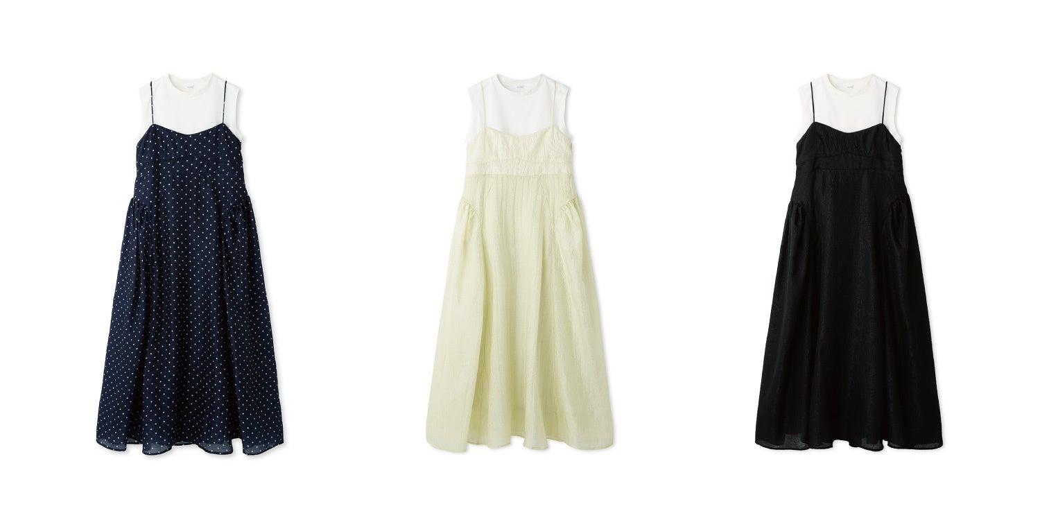 ノースリーブのカットソーとシアー感のあるキャミワンピースがセットになったアイテム。ワンピースはシアーで表面感のある素材なので、カッティングデザインとボリュームのあるパネルスカートが上品なコクーンシルエットを作り出します。