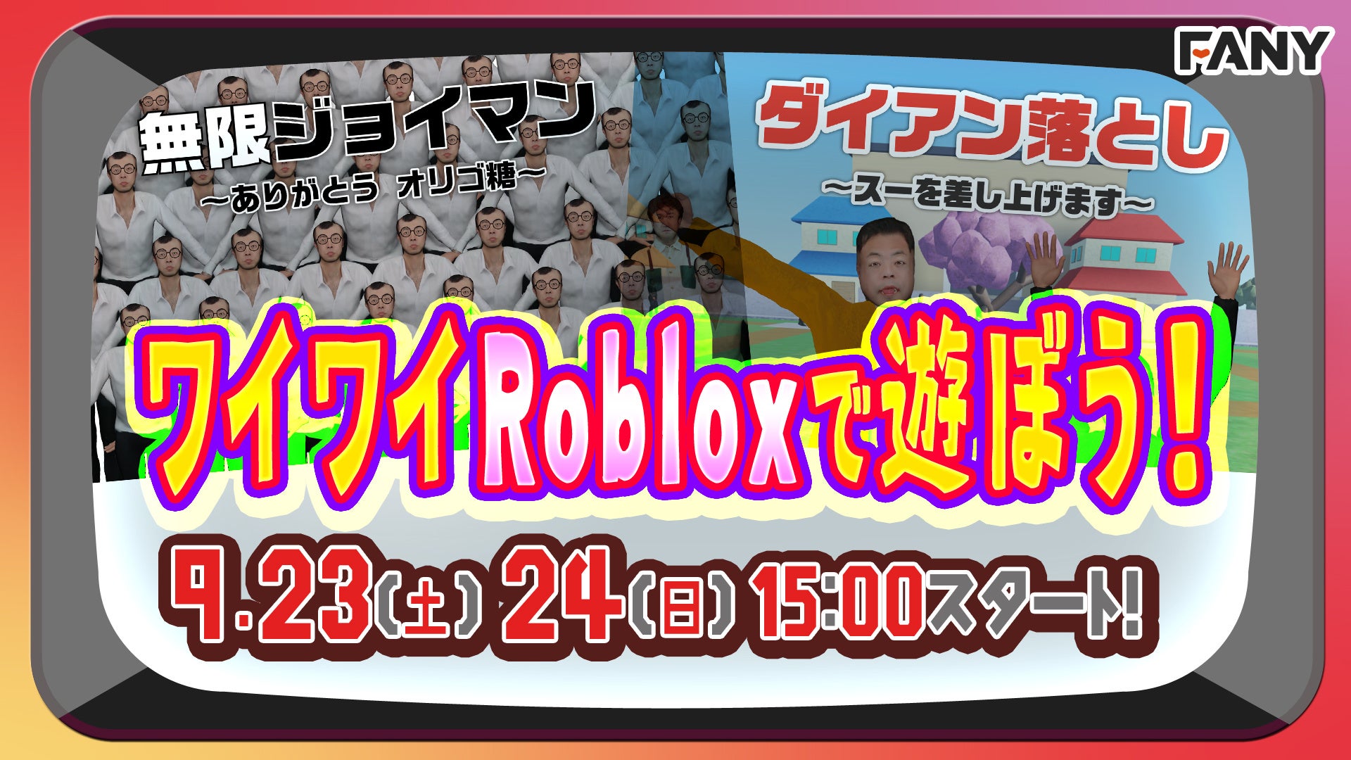 ゲーム好き芸人がステージに集まり、Robloxの人気ゲームで遊ぶステージ企画。「ダイアン落とし」「無限ジョイマン」「風雲!たけし城」をプレイします。会場参加のお客様も、配信をご覧のみなさまもお手元にゲームを用意して芸人と一緒に遊びましょう!
