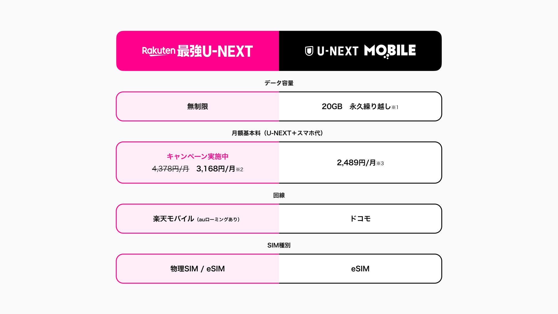 ※3:U-NEXTの月額プラン2,189円とU-NEXT MOBILEの月額基本料の合算金額です。