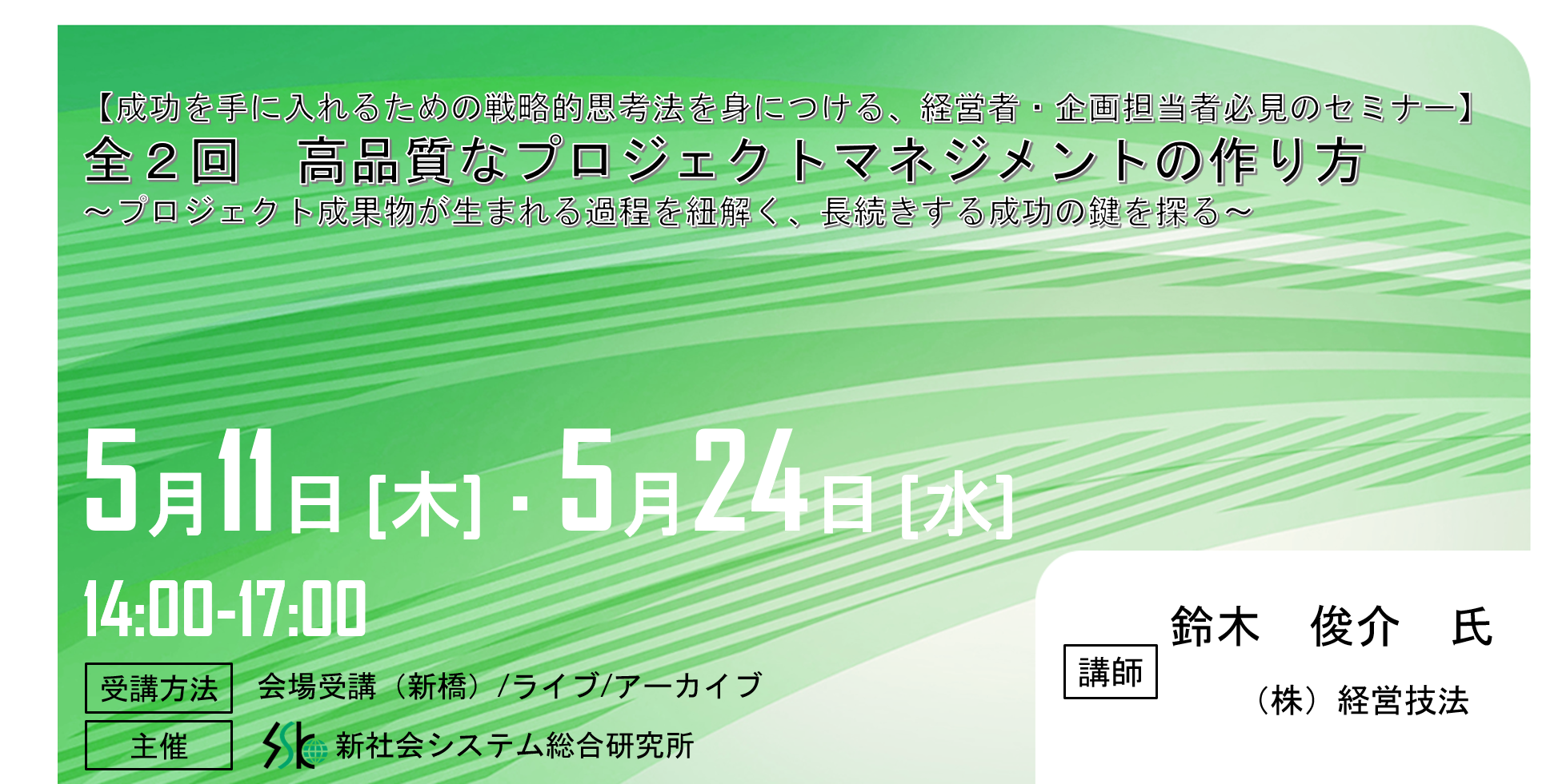 「全2回 高品質なプロジェクトマネジメント」と題して、(株)経営技法 代表取締役社長 鈴木 俊介氏によるセミナーを2023年5月11日(木)、5月24日(水)に開催!!