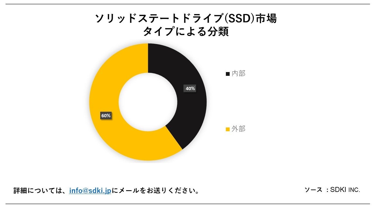 タイプに基づいて、内部型セグメントは、世界のSSD市場の73%のシェアを占め、市場で重要な位置を占めています。内蔵型ソリッド・ステート・ドライバーは、瞬時のロード性能、起動時間の向上、システム全体の応答性で知られています。例えば、CMRのIndia Hard Drive Market Review for Q1 CY2022によると、インドの消費者向け内蔵型SSD市場の出荷台数は、前四半期比3%減となりました。しかし、市場全体では前年同期比119%の大幅な伸びを記録しています。