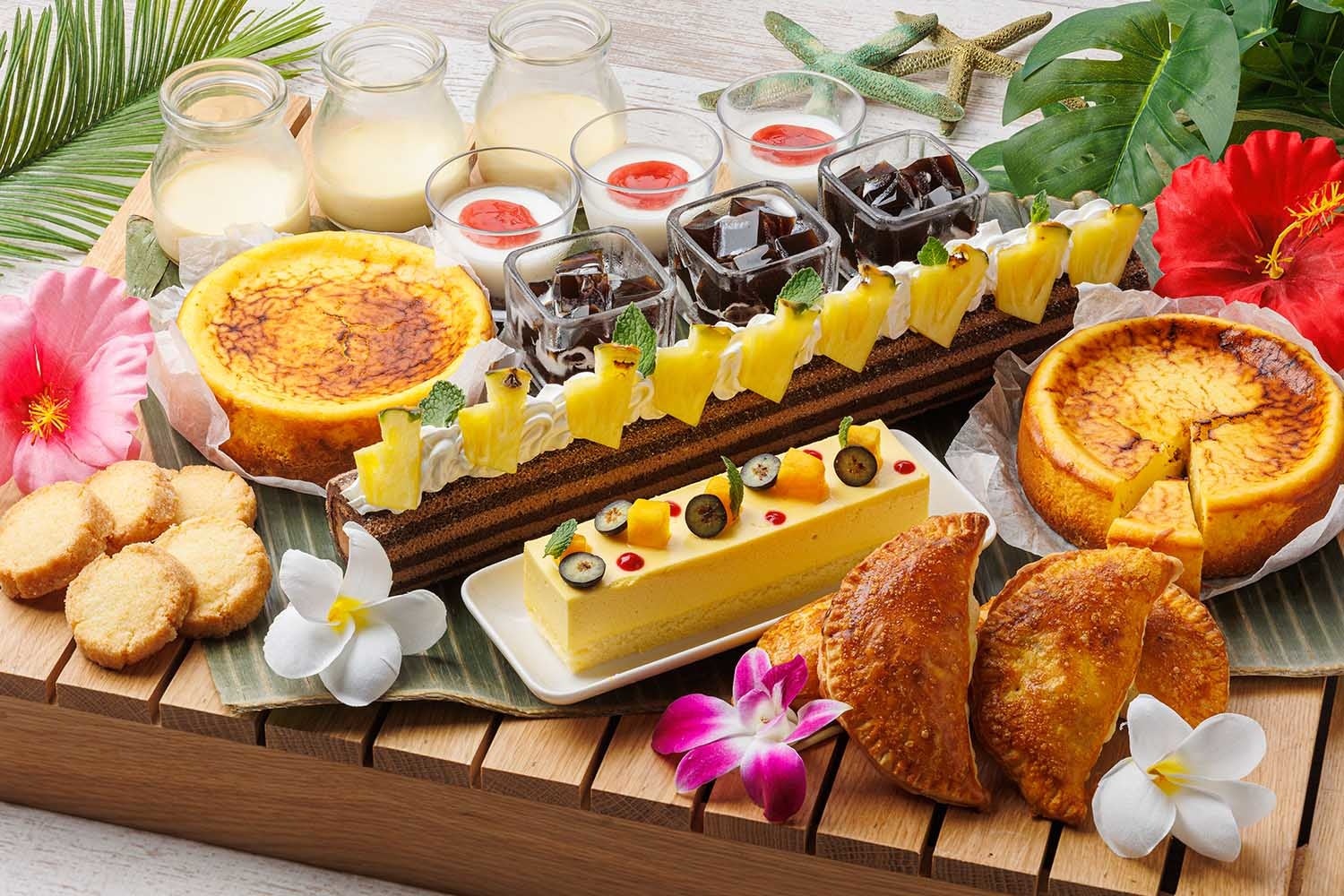 パイン&マンゴーケーキ/ハウピア/プリン/マンゴームース入りココナッツスープ/チョコレートロールケーキ/パイナップルのチーズケーキ/マラサダドーナツ/コナコーヒーのゼリー/ココナッツクッキー 等