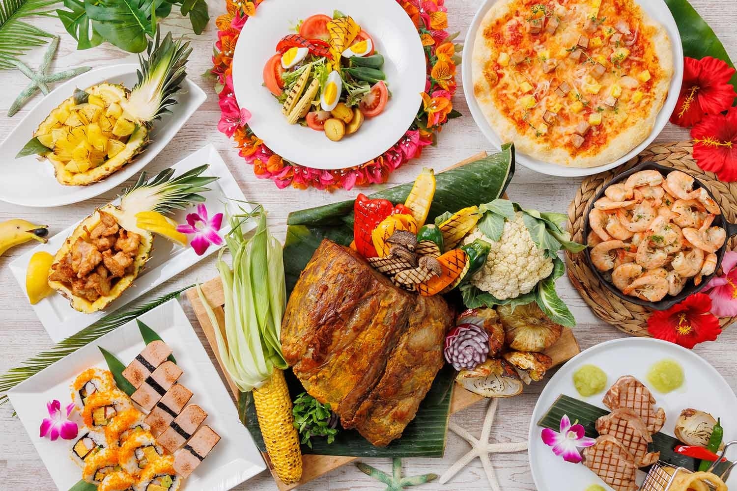 カリフォルニアロール/ポケ丼/スパム握り/海老のマヨネーズソース マンゴー風味/もち粉チキン/カルアポーク アーカラ風/ガーリックシュリンプ/カラマリのフライ/サイミン/パイナップルのロースト/シーフードのロミロミ/ミニハワイアンバーガー/ナチョス 等