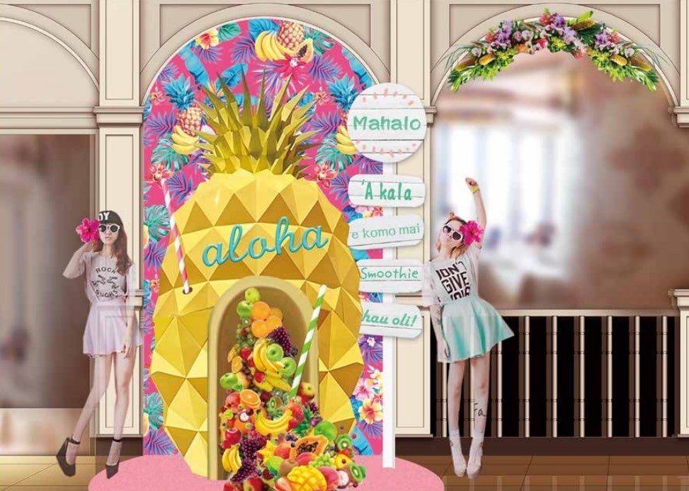 ハワイアンフェア期間中、エントランスには「ハワイ」をイメージした、色鮮やかなパステルカラーの巨大なパイナップルとフルーツがゲストをお出迎え。リゾート気分をさらに盛り上げます。