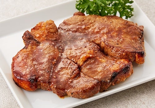 ジューシーで食べ応え満点の厚切り豚ロース肉を醬油ベースのこくのあるタレに漬け込み焼き上げました。