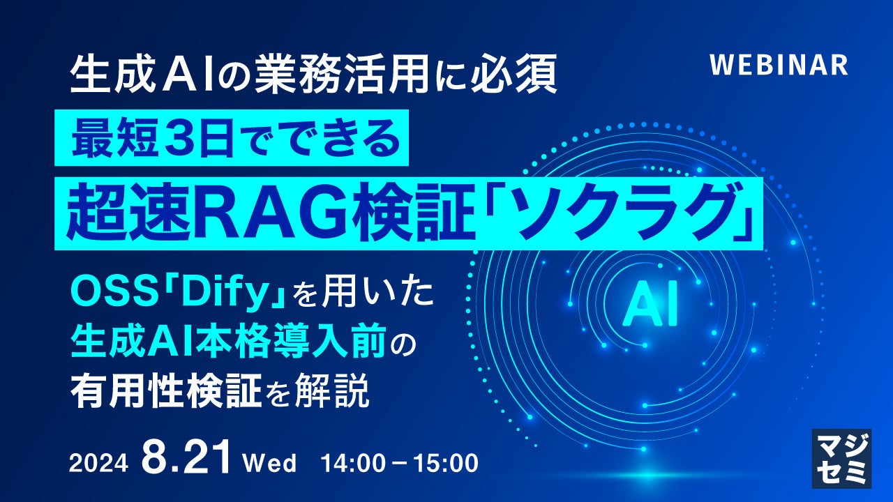 マジセミ株式会社は『最短3日、生成AI活用RAG検証「ソクラグ」』というテーマのウェビナーを開催します。