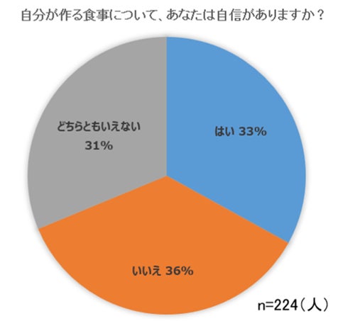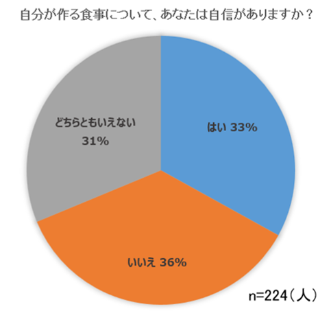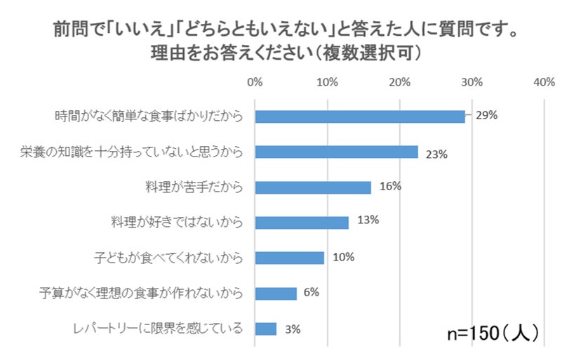 自信がない理由の1位「作る時間がなく簡単な食事ばかりだから」(29%)、2位「栄養の知識を十分に持っていないと思うから」(23%)と続く。他、レパートリーの限界を感じている(3%) という声も。