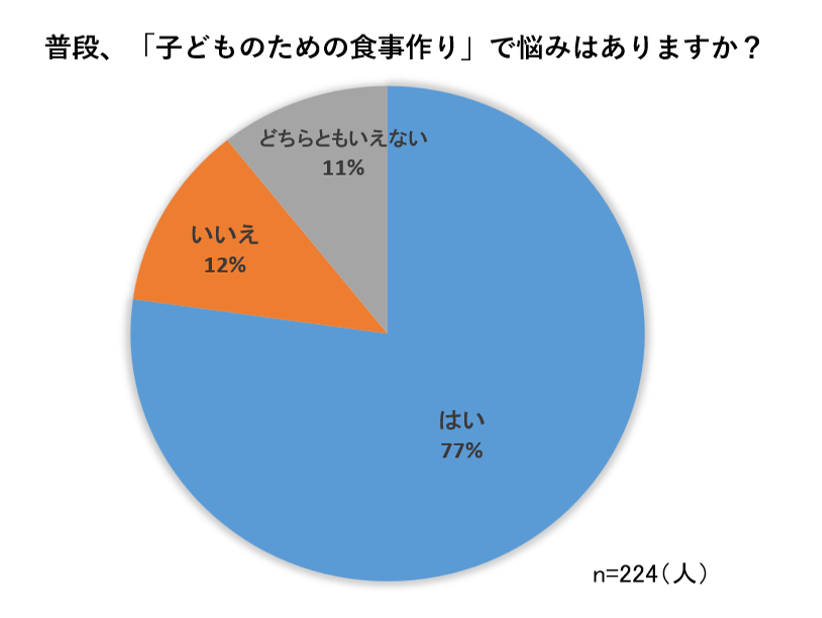 77%の人が「子どものための食事作り」で悩んでいる。「必要な栄養が摂れているか」「栄養バランスがいいか」という、栄養に関することが一番の悩み。