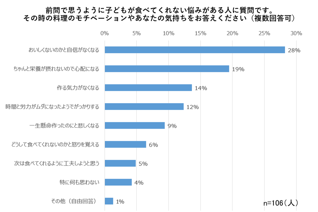 1位は「おいしくないのかと自信がなくなる」(28%)、 2位に「ちゃんと栄養が摂れてないので心配になる」(19%)と続き、「作る気力がなくなる」「がっかりする」「悲しくなる」「怒りを覚える」といったマイナス感情も並ぶ結果に。