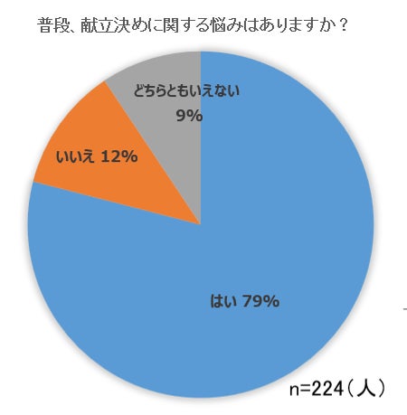 献立決めで悩んでいる人は、約8割。必要な栄養素を確保するレパートリーの少なさに悩んでいる人が多い。