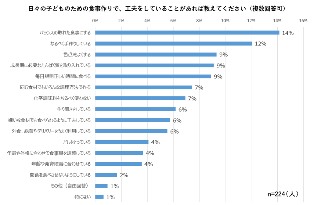 1位「バランスの取れた食事にする」(14%)、2位「なるべく手作りしている」(12%)、同率3位で「成長期に必要なたんぱく質を取り入れている」「色どりをよくする」「毎日規則正しい時間に食べる」(9%)という結果に。さまざまな工夫を続けている人が多い。