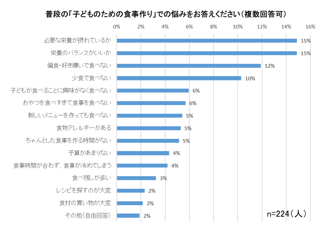 2大悩みは、「栄養」に関することと、「食べないこと」。 「必要な栄養が摂れているか」(15%)、「栄養バランスがいいか」(15%)、次いで「偏食・好き嫌いで食べない」(12%)、「少食で食べない」(10%)。他にも、「家族全員が満足するレパートリーの少なさ」や「大人用と子ども用を作るのが大変で悩んでいる」など悩みは多岐にわたった。