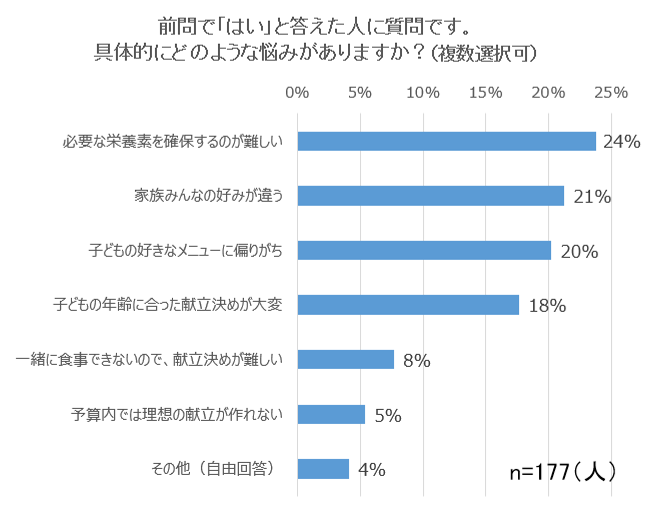 24%の人が「必要な栄養素の確保」が難しいと回答。つづいて、「家族みんなの好みが違う」(21%)、「子どもの好きなメニューに偏りがち」(20%)など。年齢も好みも違う家族の食事の献立決めに悩んでいる様子がうかがえる。