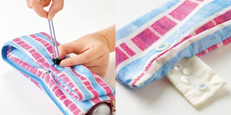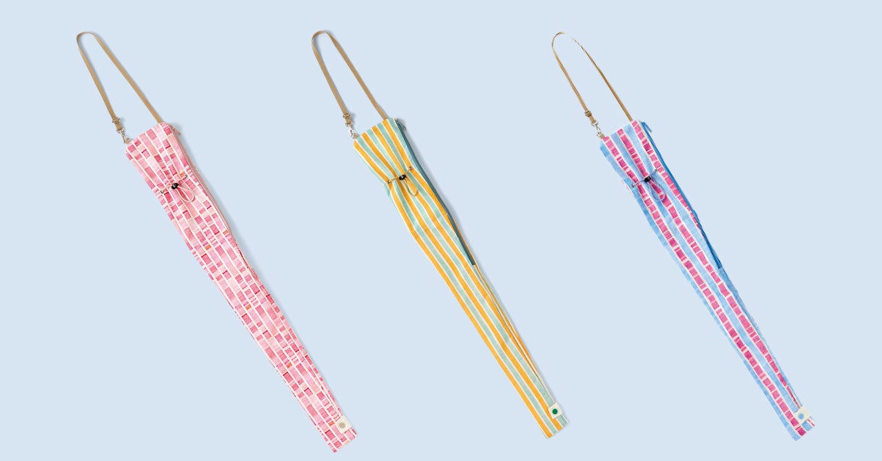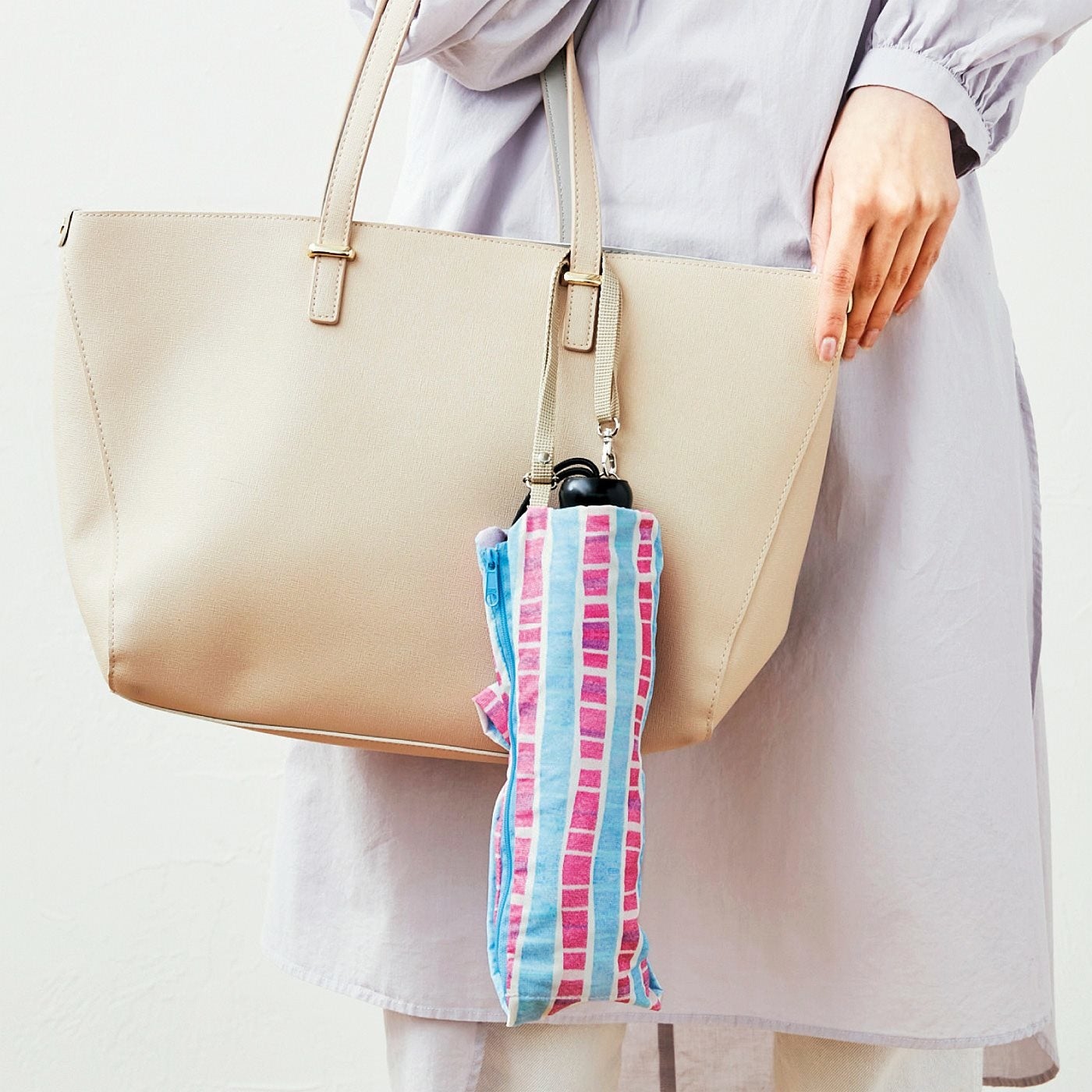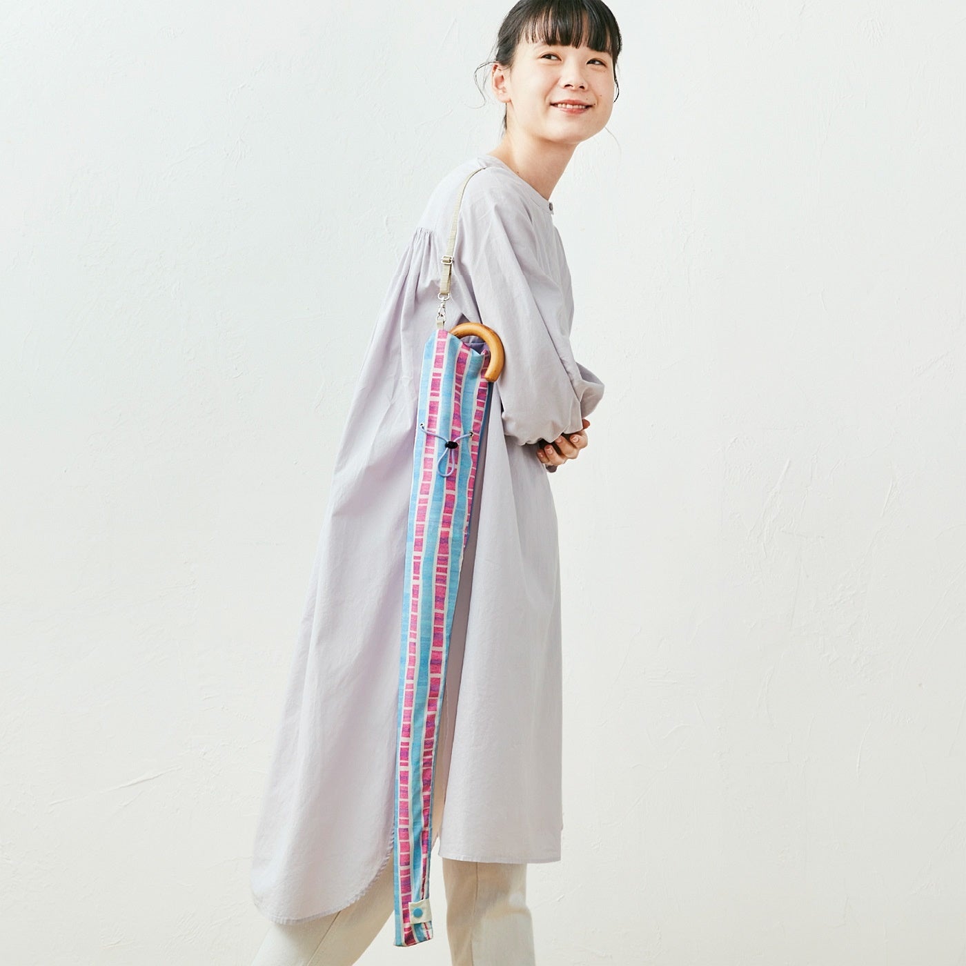 刺しゅうのように見えるストライプ模様がさわやかな印象の傘ケースです。サイズを調節すれば、長傘と折りたたみ傘のどちらにも使えます。ストラップの調節で肩に掛けたりバッグに付けたりできるので、持ち歩きに便利です。