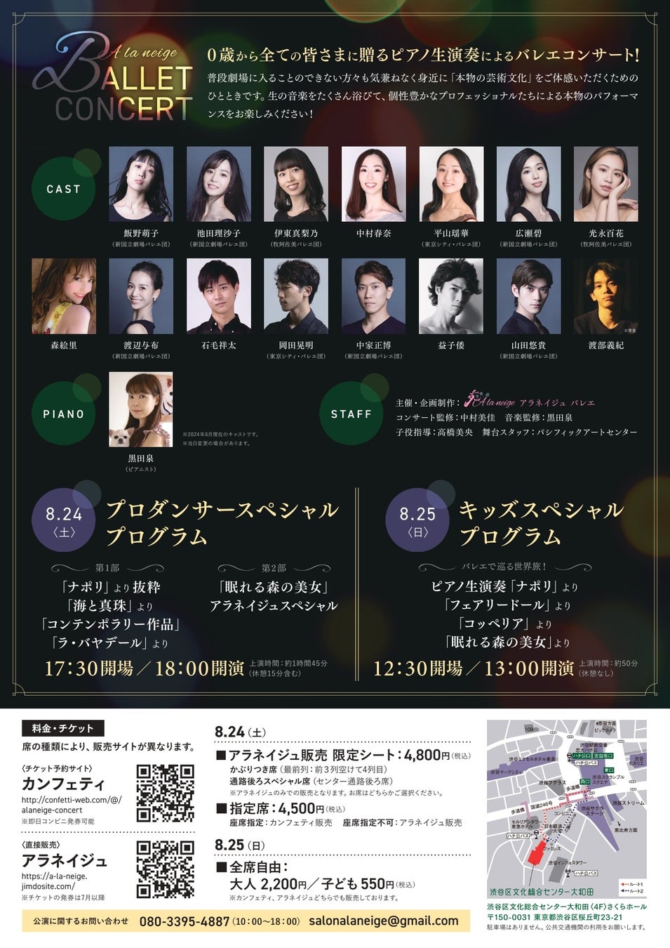 0歳からの未就学児も鑑賞可能なピアノ生演奏による「生演奏&バレエコンサート」を今夏も渋谷区文化総合センター大和田さくらホールにて開催します! 普段劇場に入場することが出来ない未就学児のお子様にも大人の皆さまにも「本物を身近に体験してほしい」との思いから生まれた本格バレエコンサートです。物語を感じていただける選りすぐりの作品と生の音楽に拘り、全演目ピアノ生演奏に乗せてお届けいたします!コンサートを彩るのは、素晴らしいプロフェッショナルで個性豊かなダンサー&ピアニスト!!新国立劇場バレエ団の池田理沙子や山田悠貴、YouTubeでも大人気の益子倭などによる”本物のパフォーマンス”をぜひお楽しみください!