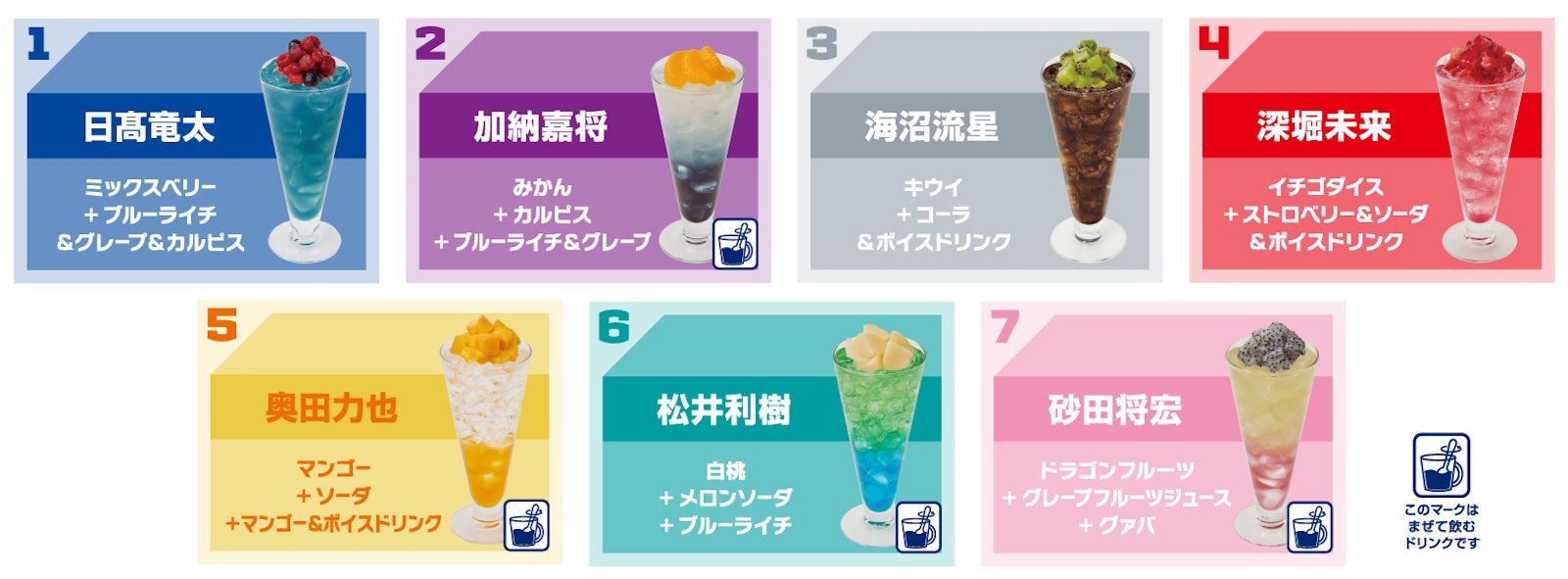 コラボドリンクには、「BALLISTIK BOYZ」のメンバー「日髙竜太」「加納嘉将」「海沼流星」「深堀未来」「奥田力也」「松井利樹」「砂田将宏」をイメージした全7種をご用意します。注文特典として、コラボドリンク1品ご注文につき、オリジナルポストカードを全14種【第1弾:7種/第2弾:7種】の中からランダムで1枚プレゼント!
