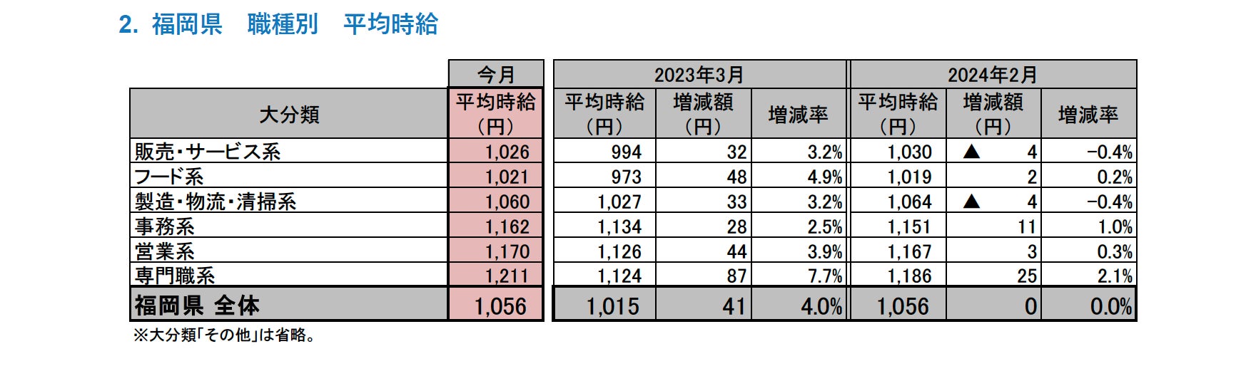 [福岡県版]2024年3月度 アルバイト・パート募集時平均時給調査 福岡県の3月度平均時給は前年同月より41円増加の1,056円