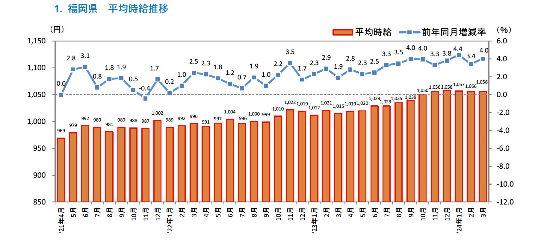 ■福岡県の平均時給は1,056円(前年同月1,015円、前月1,056円)