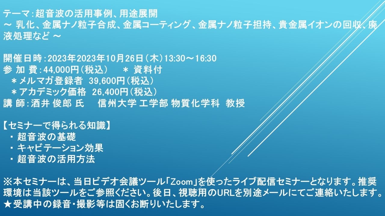 【ライブ配信セミナー】超音波の活用事例、用途展開~乳化、金属ナノ粒子合成、金属コーティング、金属ナノ粒子担持、貴金属イオンの回収、廃液処理など10月26日(木)開催 主催:(株)シーエムシー・リサーチ