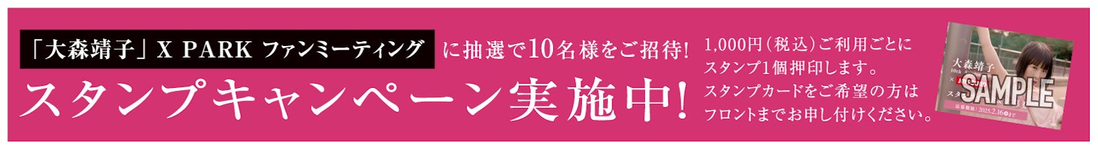 さらに、コラボドリンクご注文でお渡しするスタンプカードに、カラオケご利用金額 1,000 円(税込)ごとにもらえるスタンプを5つ集めて応募すると、「『大森靖子』X PARKファンミーティング」に抽選で10名様をご招待する、スタンプキャンペーンも実施します!