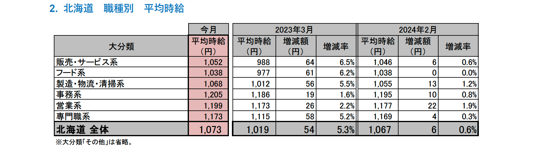 ■北海道の平均時給は1,073円(前年同月1,019円、前月1,067円)