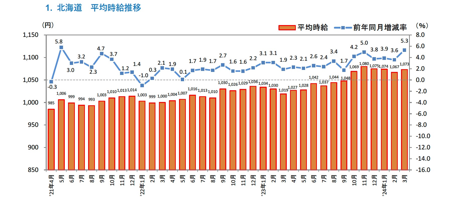 [北海道版]2024年3月度 アルバイト・パート募集時平均時給調査 北海道の3月度平均時給は前年同月より54円増加の1,073円