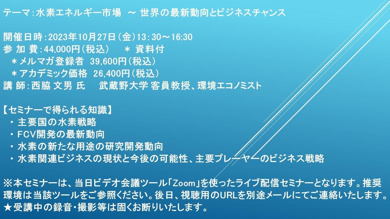 【ライブ配信セミナー】水素エネルギー市場 ~ 世界の最新動向とビジネスチャンス 10月27日(金)開催 主催:(株)シーエムシー・リサーチ
