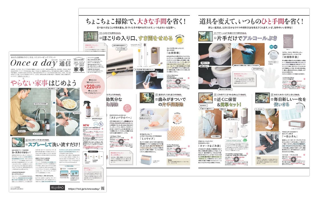 フェリシモが展開する“予防家事®”を提案するハウスキーピングブランド「Once a day[ワンス ア デイ]」は新アイテムを発表、3月11日よりウェブ販売を行っています。新作は、「お皿にスプレーして、洗い流すだけの食器用洗剤」や「研磨剤とスポンジが合体したシンクワイパー」です。食器洗いや、サボりがちになる水回りの掃除を、簡単に負担なく続けられる便利な新作は、公式サイトのほか、デジタルカタログでもチェックできます。